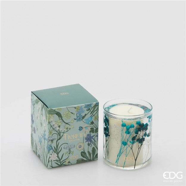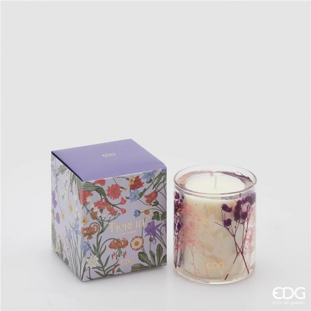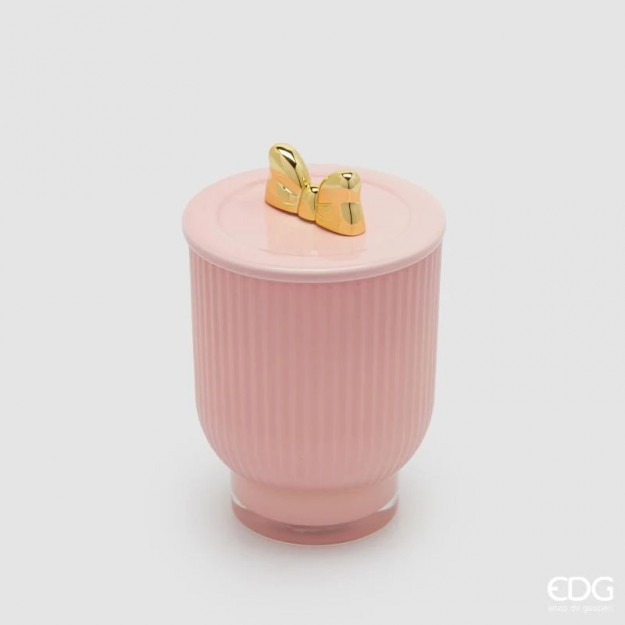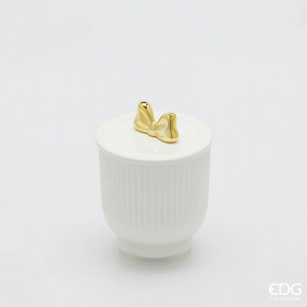 Elegante candela decorativa in vetro bianco lucido con finitura a costine e coperchio con fiocco dorato. Il contenitore può essere riutilizzato...
