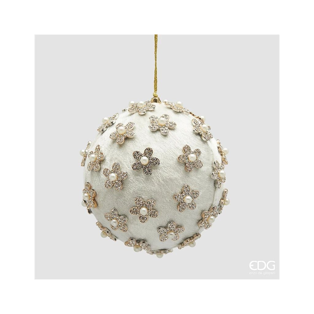 Romantica e luminosa, la Pallina Flower di EDG dona charme e raffinatezza alle decorazioni natalizie. Realizzata in tessuto bianco perlato effetto velluto, è impreziosita da motivi floreali dorati con strass e perla centrale, per un tocco sofisticato e senza tempo.