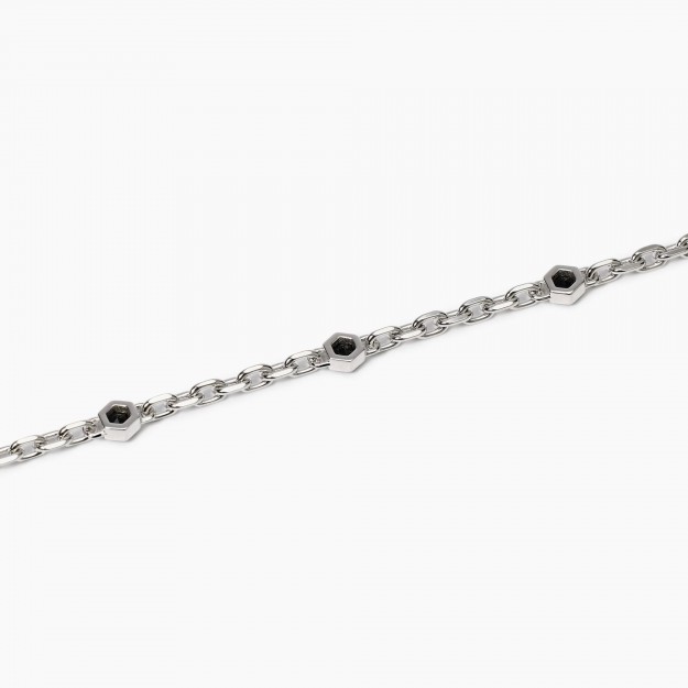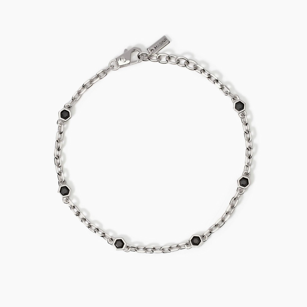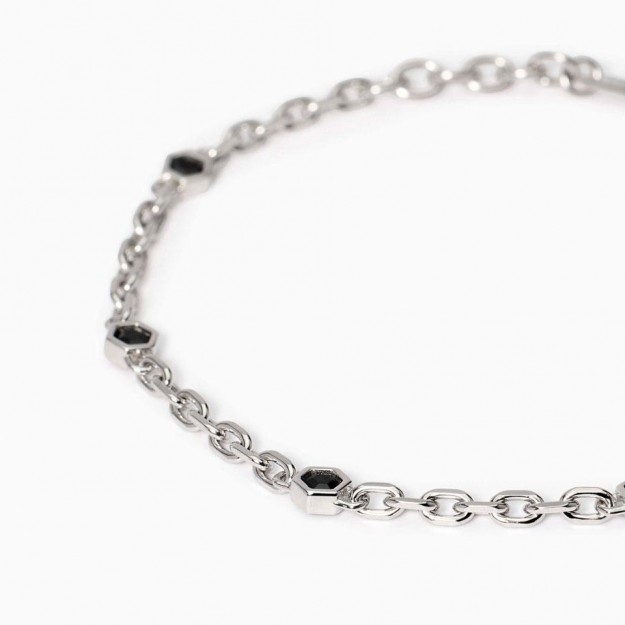 Bracciale in argento rodiato con catena forzatina e zirconi neri esagonali.