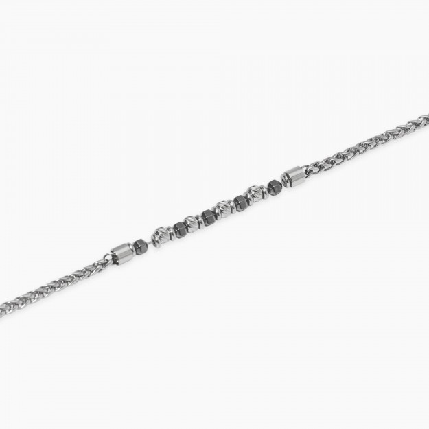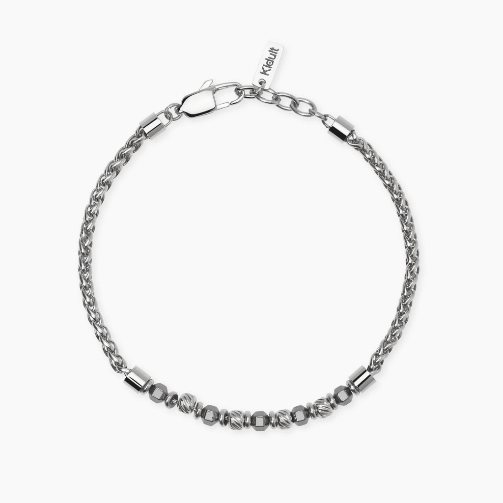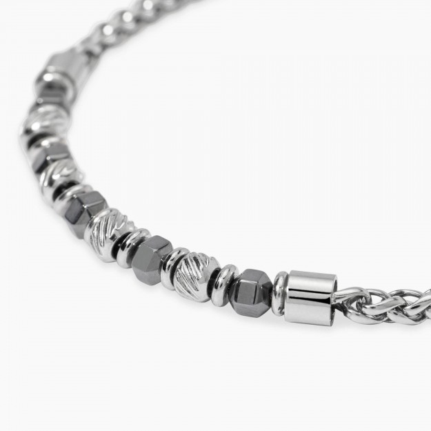 Bracciale regolabile con catena spiga in acciaio e cilindri lucidi a strisce e faccettati in ematite.
