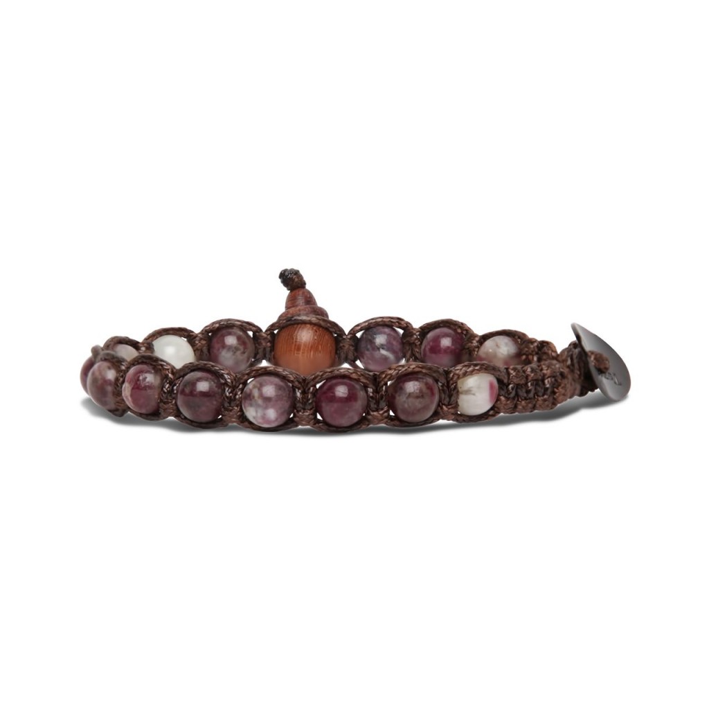 Bracciale originale tibetano Tamashii realizzato con pietra naturale Tormalina Rosa e cordoncino marrone.