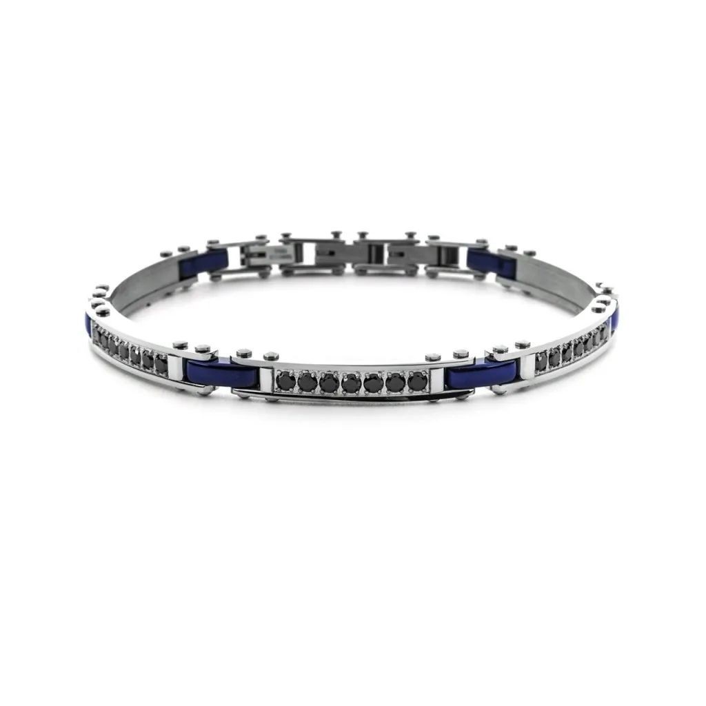 Bracciale da uomo realizzato in acciaio anallergico con finitura rodiata e inserti in ceramica blu e file di zirconi neri.