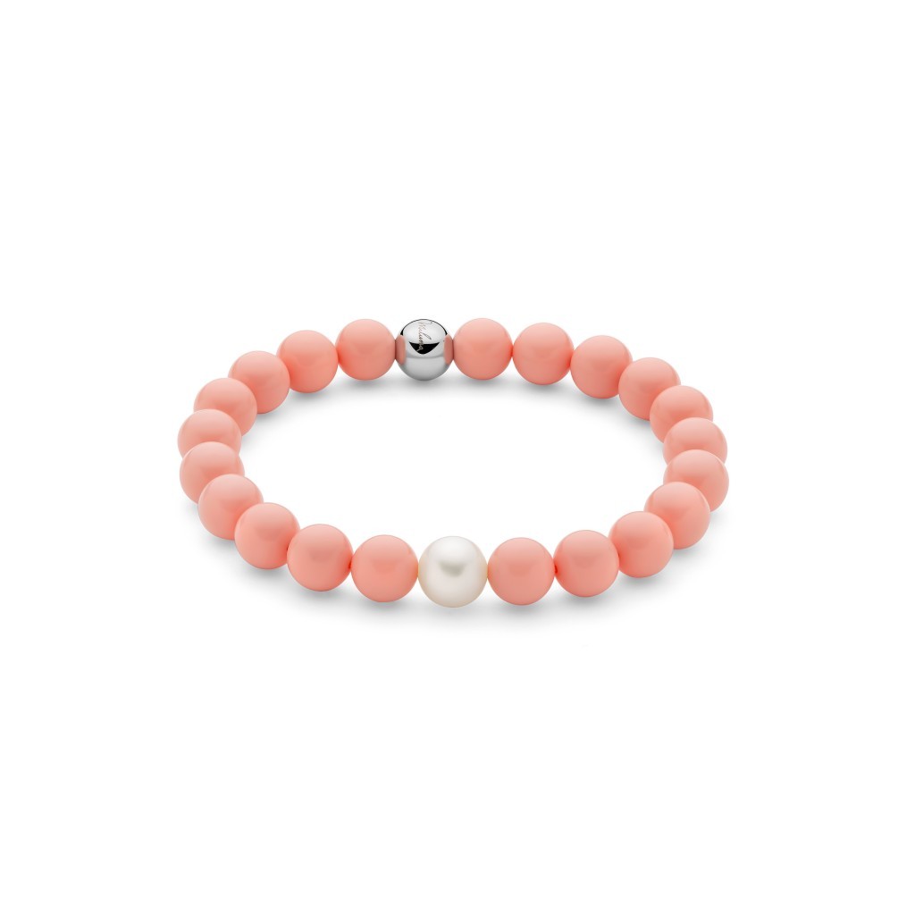 Bracciale collezione Terra e Mare in agglomerato di corallo rosa 8 mm e una perla bianca vera 8,5-9 mm centrale. Grazie al suo elastico si adatta a tutti i polsi ed è faile da indossare.