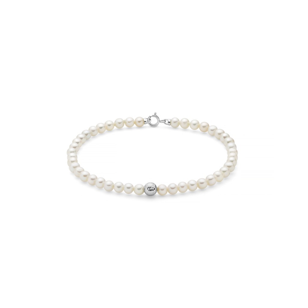 Bracciale con perle coltivate diametro 4/4,5 mm, sfera centrale diamantata e chiusura a moschettone in oro bianco 750 (18 kt). La lunghezza del bracciale è di 20 cm.