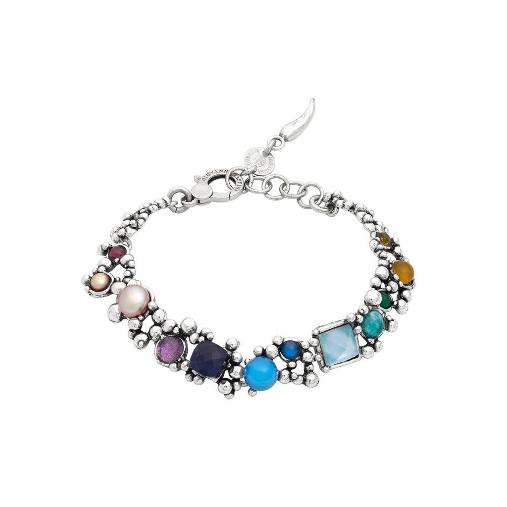 Questo bracciale in argento brunito prende vita dall’armonia di dodici gemme colorate che dialogano tra loro, creando equilibrio e movimento in un gioco di luce continuo. Tra queste spiccano la doppietta di madreperla e cristallo celeste dal taglio quadrato sfaccettato, l’agata naturale scolpita a funghetto, le perle naturali d’acqua dolce, l’ametista naturale con taglio cabochon e le preziose siamiti. Una piccola opera d’arte da indossare con naturale eleganza, capace di valorizzare il polso con grazia e carattere. La chiusura è impreziosita da una catena tonda regolabile.