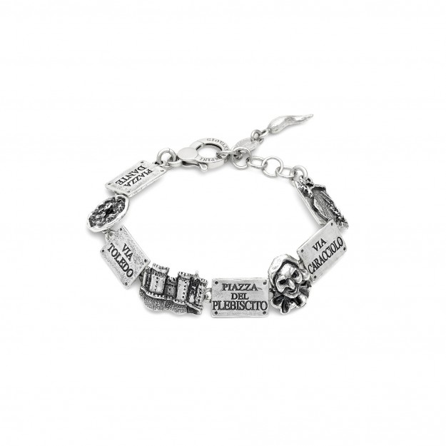 Un bracciale in argento brunito firmato Giovanni Raspini che racconta Napoli con microsculture iconiche: la pizza, Pulcinella, il Maschio Angioino,...