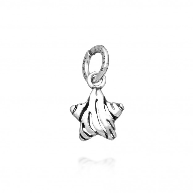 Questo charm in argento brunito è realizzato completamente a mano tramite la tecnica della fusione a cera persa. Una stella dalla forma morbida e tridimensionale, vuota all'interno e dalla superficie incisa in striature che richiamano il mondo animalier.