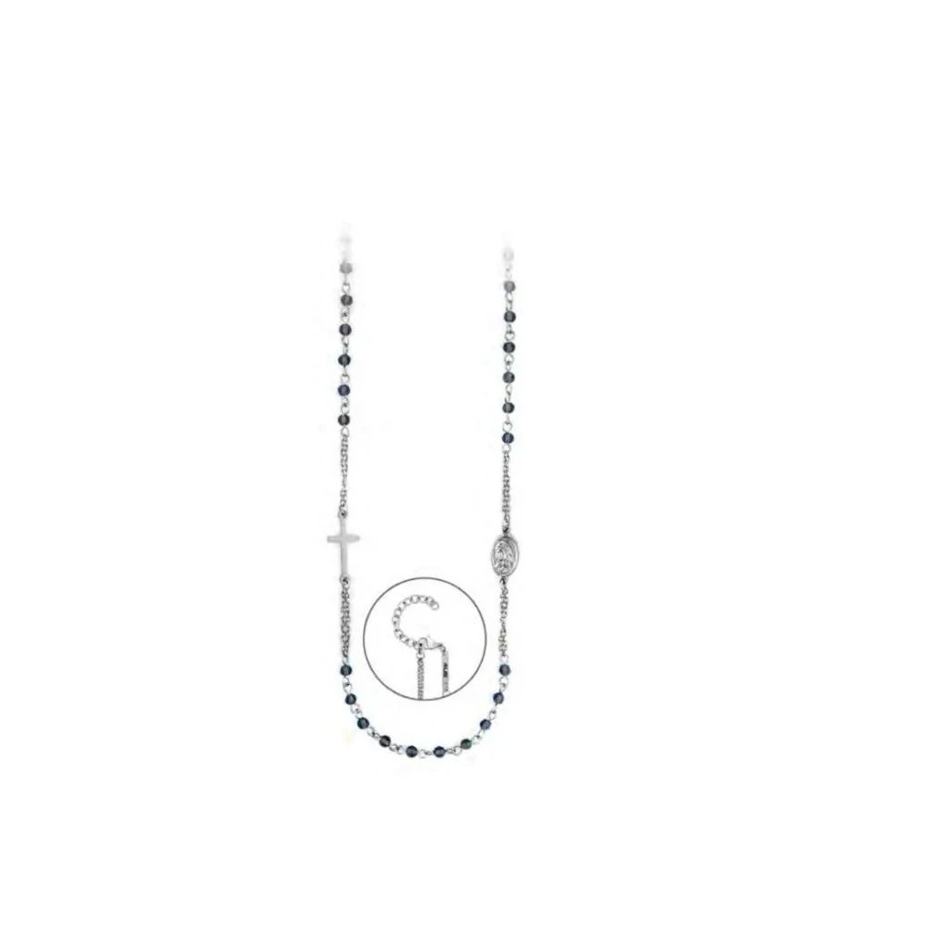 Collana con croce e medaglia inserite ,realizzato in acciaio con biglie blu. Misura: 50 Cm + 5 Cm di riduzione.