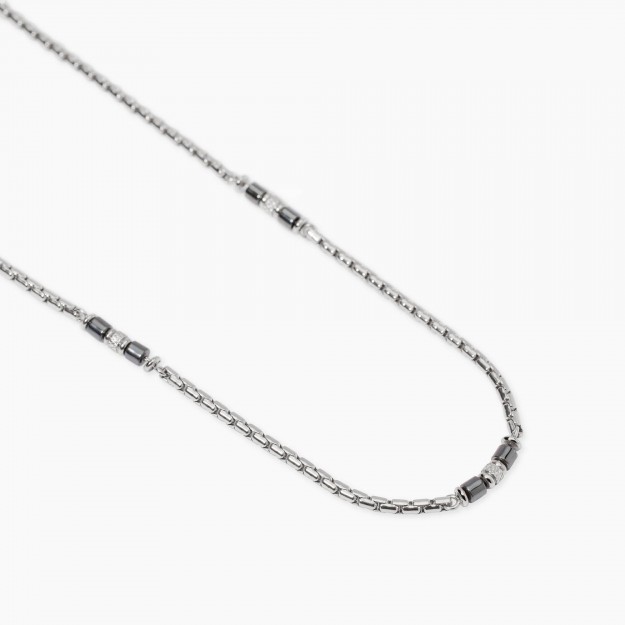 Collana con catena veneta ed elementi a strisce e cilindri in ematite.