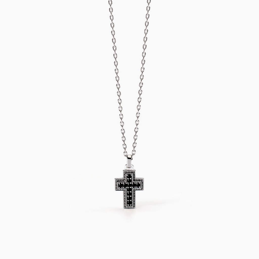 Collana regolabile da uomo in argento rodiato con catena forzatina e pendente croce con zirconi neri.