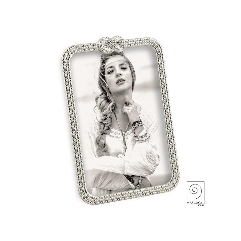 Cornice portafoto in silver plated dal design elegante e luminoso,caratterzzata da una raffinata lavorazione a rilievo.Impreziosita da un elegante dettaglio a forma di nodo nella parte superiore,è perfetta per valorizzare i tuoi ricordi più speciali con un tocco di classe.Ideale come idea bomboniera per cerimonie o come regalo elegante e ricercato.