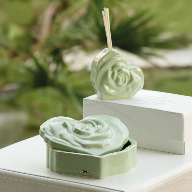 Il verde salvia della collezione Formia in vetro effetto porcellanato unisce naturalezza e raffinatezza. La forma ispirata al cuore e al bocciolo di rosa si veste di una tonalità morbida e armoniosa, creando un oggetto elegante e contemporaneo che trasmette calma, freschezza e bellezza autentica.