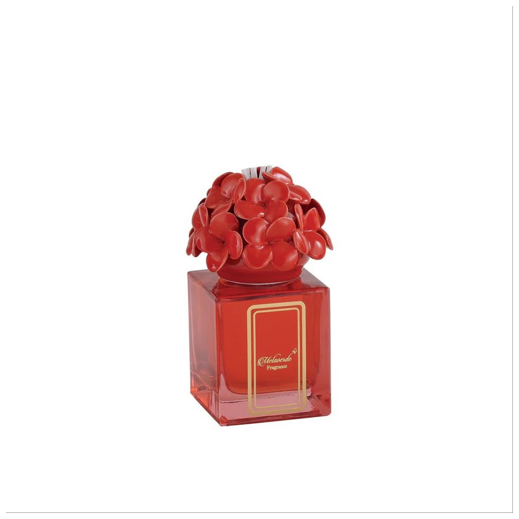Profumatore in vetro con decoro Ortensie dell'azienda Melaverde completo di bacchette. Il decoro è realizzato interamente a mano in ceramica di capodimonte.