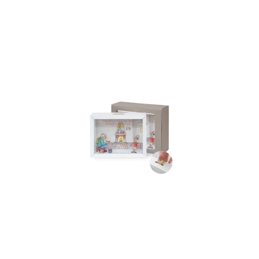 Salvadanaio in legno e vetro con stampa di PINOCCHIO e frase motivazionale.