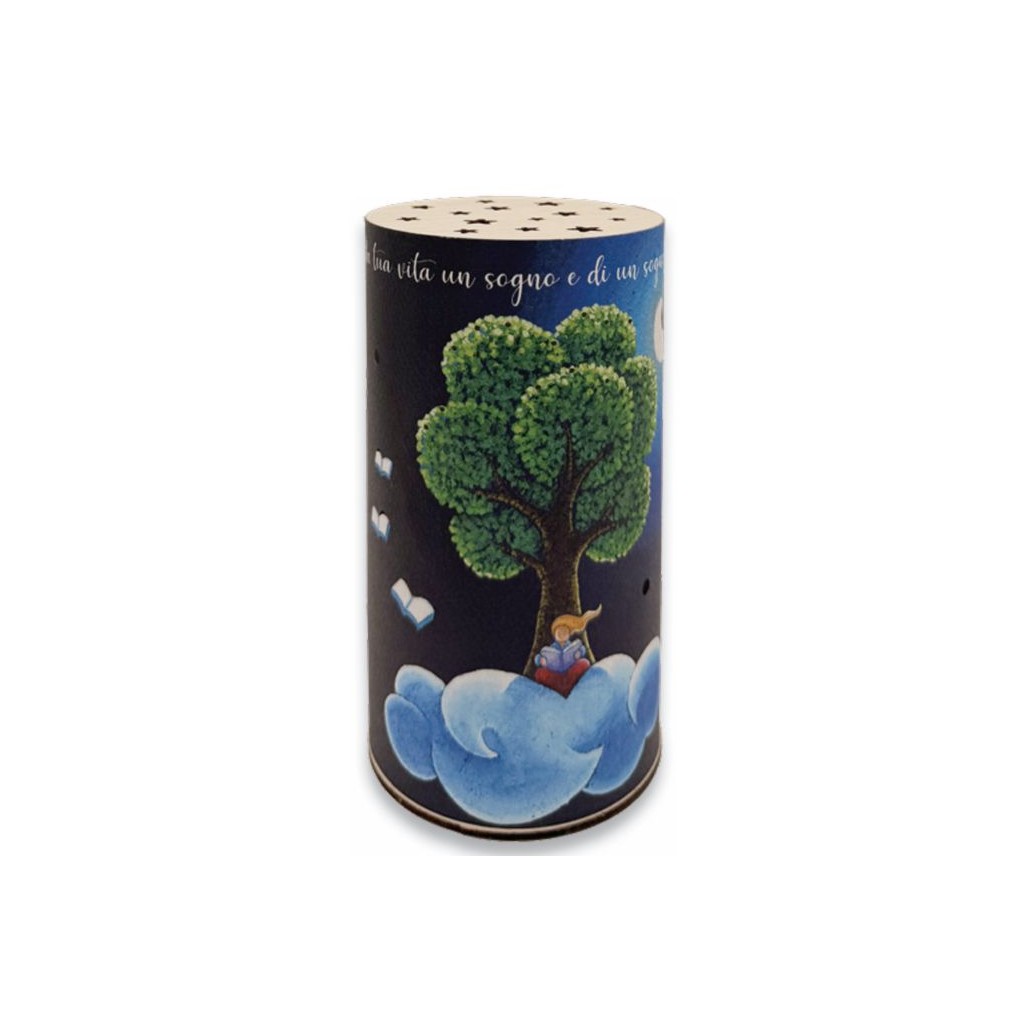 Lampada decorativa in legno e cartone con tema Albero e frase: "Fai dfella tua vita un sogno e di un sogno una realtà."