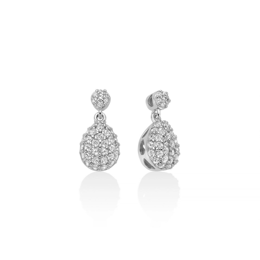 Orecchini pendenti a goccia in argento 925, illuminati da un pavé di topazi bianchi. Gioielli dalle linee classiche e ricchi di dettagli preziosi, perfetti per ogni occasione.