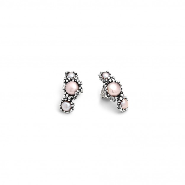 Orecchini in argento brunito con motivo floreale e sei perle rosa d’acqua dolce. Un design raffinato realizzato con lavorazione artigianale.