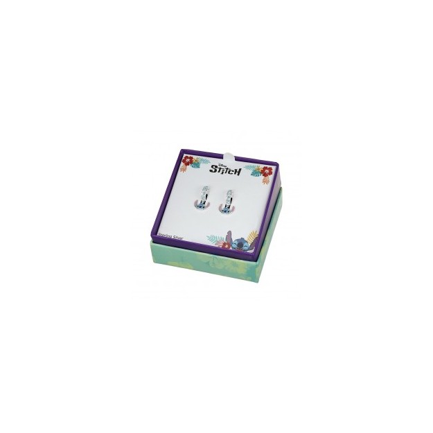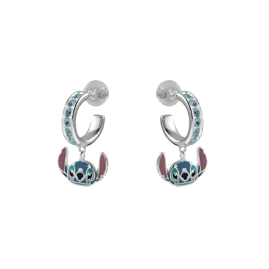 Orecchini realizzati in argento 925% con Stitch smaltato. Cerchi impreziositi da zirconi azzurri.
