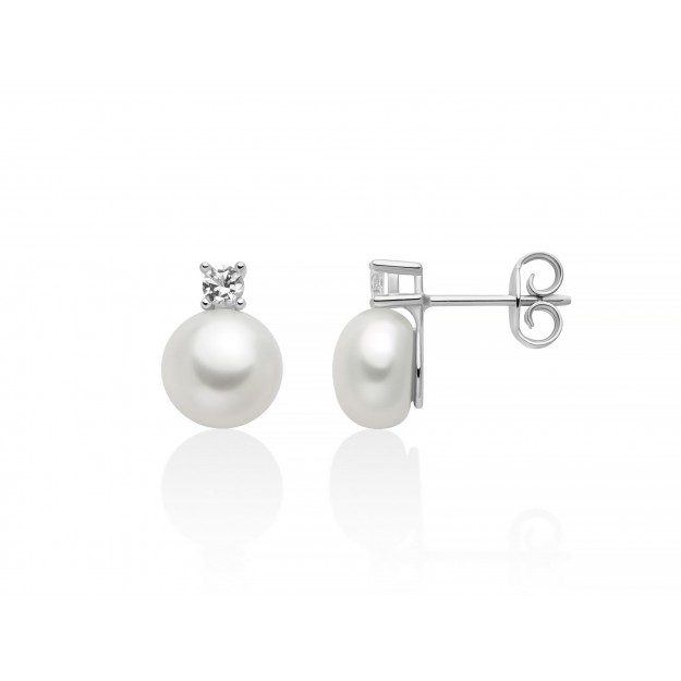 Orecchini in argento con perla Oriente 8,5-9 mm illuminata da un topazio bianco