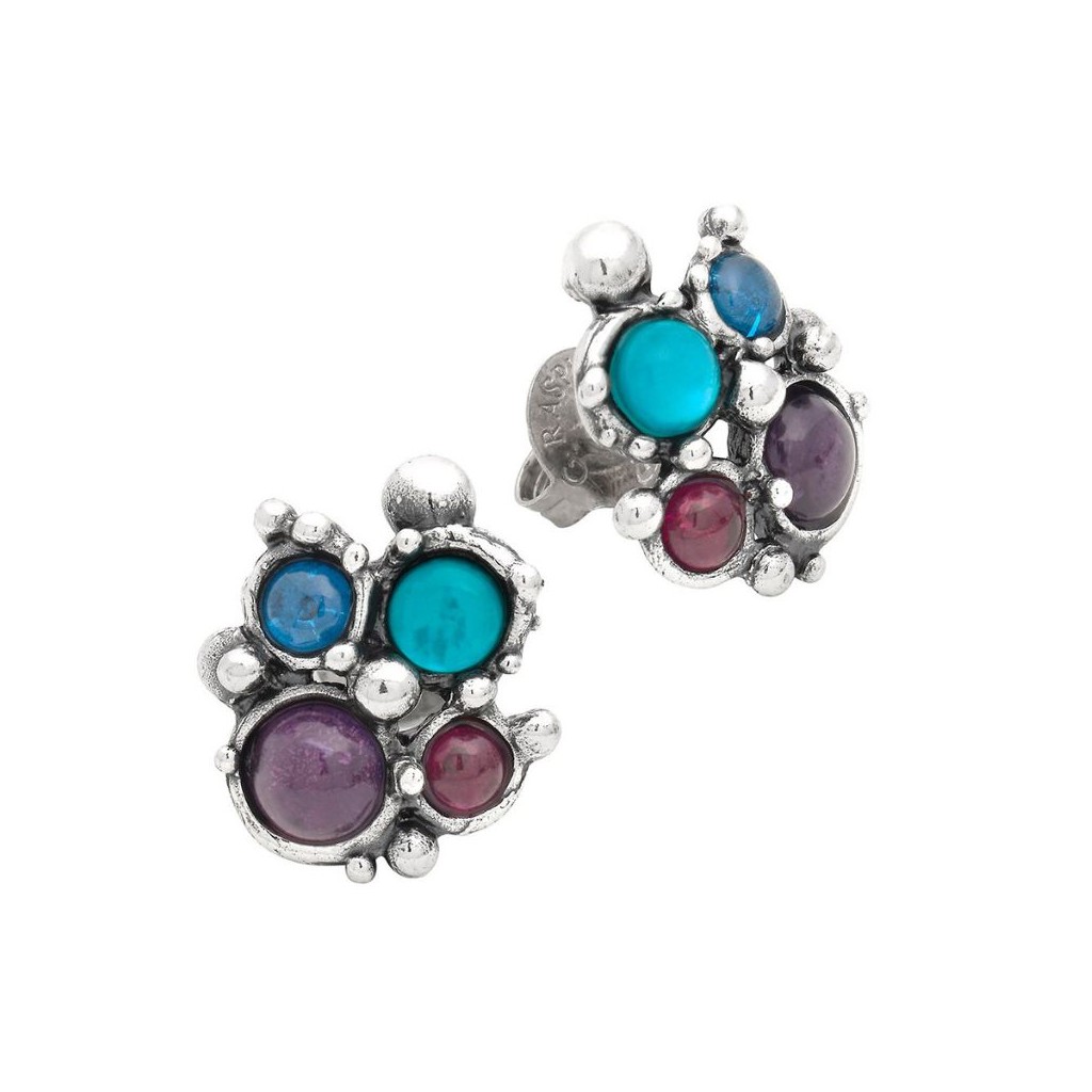 Interamente realizzati a mano, questi orecchini policromi si distinguono per la loro luminosità e unicità. La struttura in argento brunito accoglie quattro gemme cabochon,ametista, madreperla azzurra doppiata con cristallo e siamiti, creando un raffinato gioco di colore e luce.
