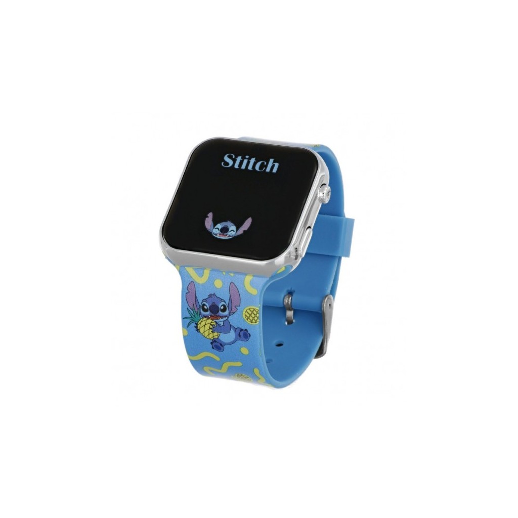 Cinturino in silicone azzurro con Stitch. Chiusura con fibbia ardiglione.