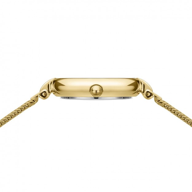 Il BERING Classic da donna (24 mm, altezza 2 mm) unisce minimalismo e lusso discreto. La cassa in acciaio dorato lucidato racchiude un quadrante argentato impreziosito da un diamante a ore 12, protetto da vetro zaffiro antigraffio. Il cinturino in maglia milanese oro garantisce comfort e stile, mentre il movimento al quarzo e la resistenza all’acqua di 3 ATM lo rendono perfetto per l’uso quotidiano.