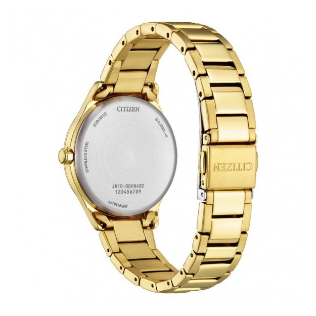 Elegante e sostenibile, l’orologio Citizen Lady unisce stile sportivo-chic e tecnologia Eco-Drive a carica solare, con autonomia fino a 8 mesi. La cassa e il bracciale in acciaio con trattamento IP oro giallo valorizzano il quadrante bianco analogico con funzione solo tempo e data. Con diametro di 34 mm, vetro minerale e impermeabilità fino a 5 ATM, è il segnatempo ideale per accompagnare con raffinatezza ogni momento della giornata.