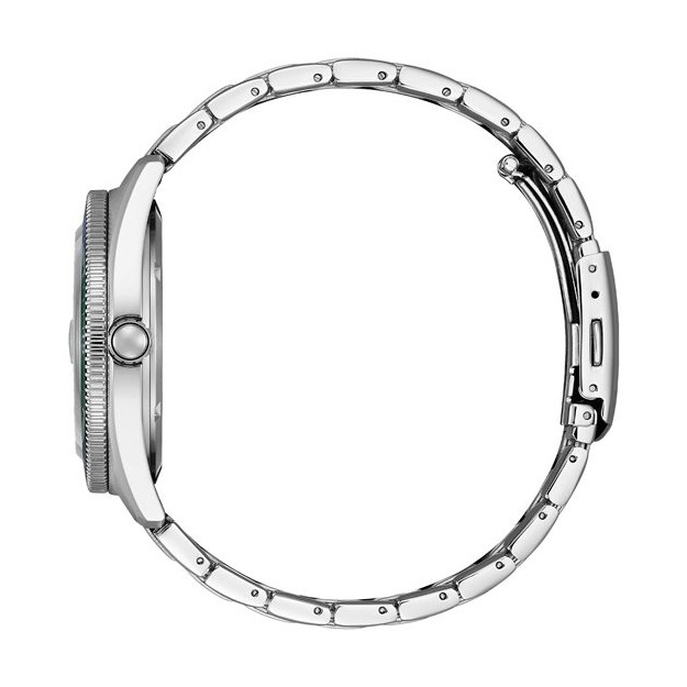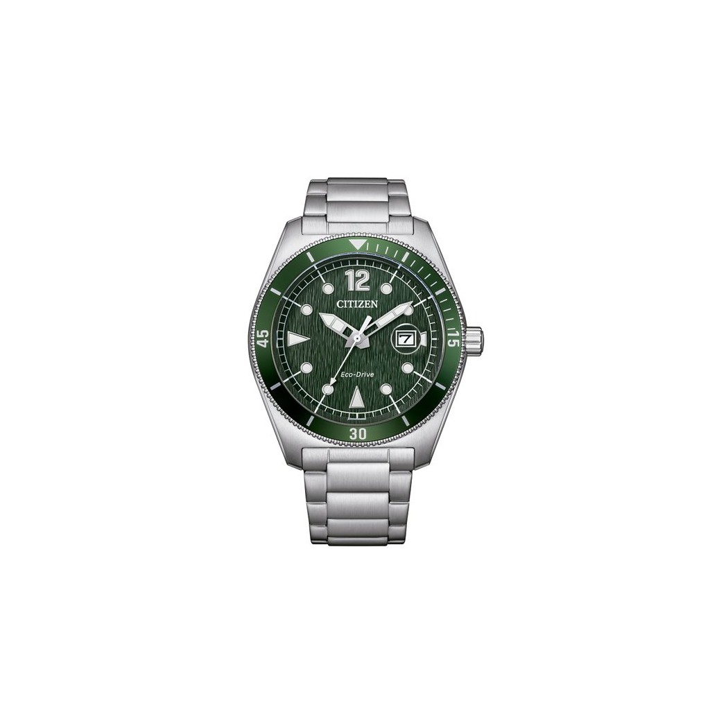Orologio Citizen Marine – Collezione OF 2026 con movimento Eco-Drive solare al quarzo, alimentato dalla luce. Design sportivo ed elegante con quadrante verde e cassa in acciaio da 43 mm, lunetta girevole e data. Impermeabile fino a 10 ATM, fondello a vite e vetro minerale: un segnatempo affidabile e sostenibile, perfetto per l’uso quotidiano e le attività outdoor.