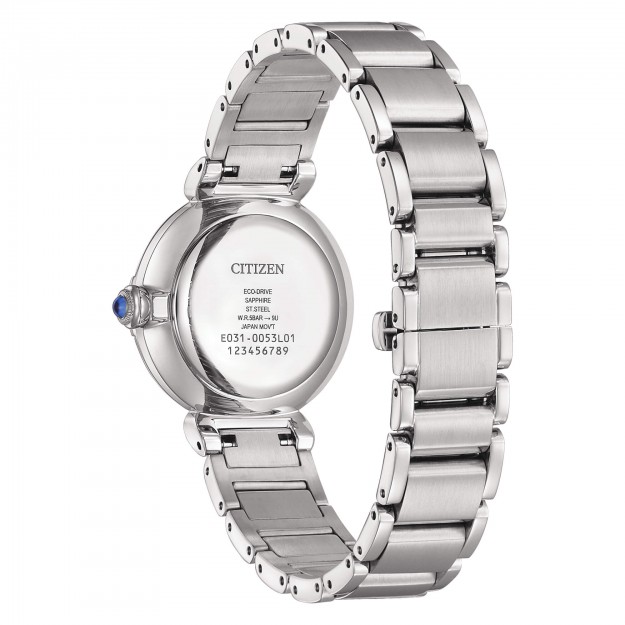 Raffinato orologio solotempo da donna con movimento Eco-Drive a carica luce, che elimina la necessità di sostituire la batteria. La cassa e il bracciale in acciaio racchiudono un luminoso quadrante in madreperla, impreziosito da un diamante posizionato ad ore 8. Vetro zaffiro convesso, corona con cabochon decorativo e impermeabilità fino a 5 bar completano un design femminile ed elegante, perfetto per ogni occasione.