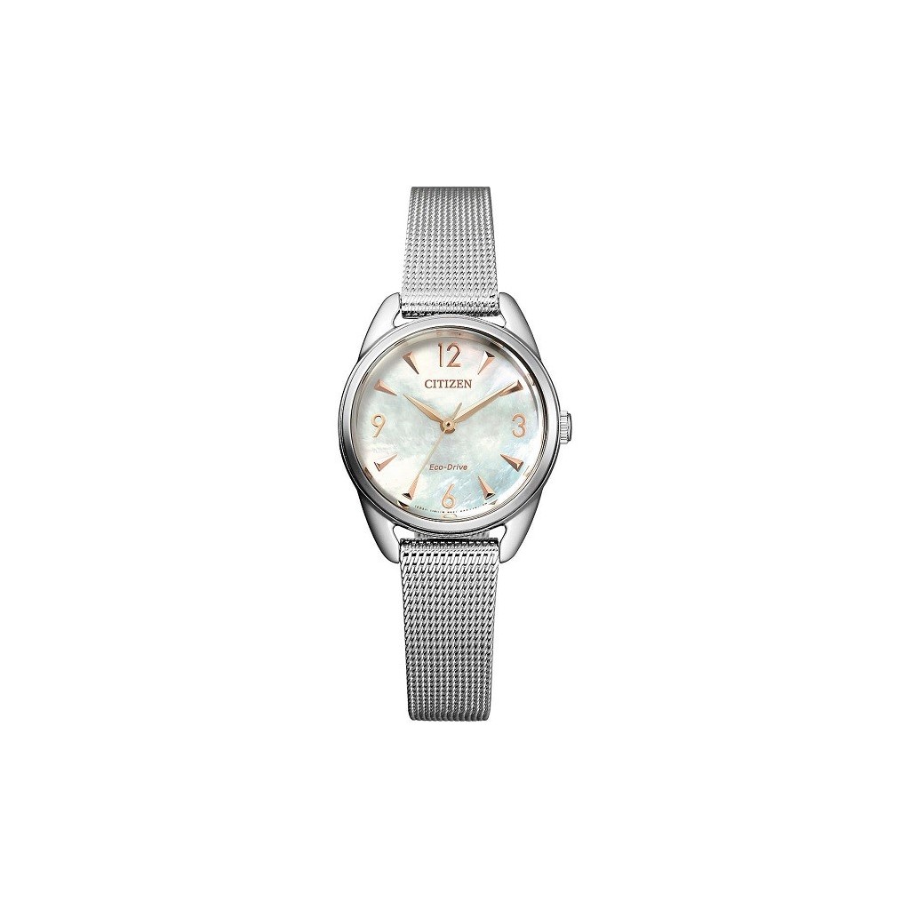 Cassa in acciaio con vetro bombato. Quadrante in madreperla. Bracciale in acciaio a "" maglia Milano"". WR.