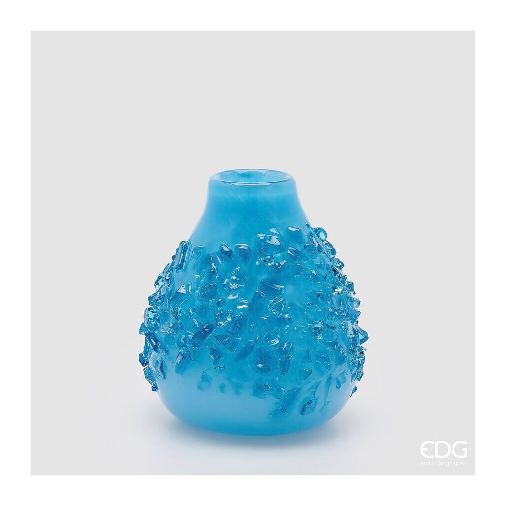 Elegante vaso decorativo in vetro azzurro, caratterizzato da una raffinata forma a goccia e impreziosito da gemme in vetro in rilievo tono su tono. La lavorazione crea delicati giochi di luce e riflessi, donando profondità e luminosità all’ambiente.