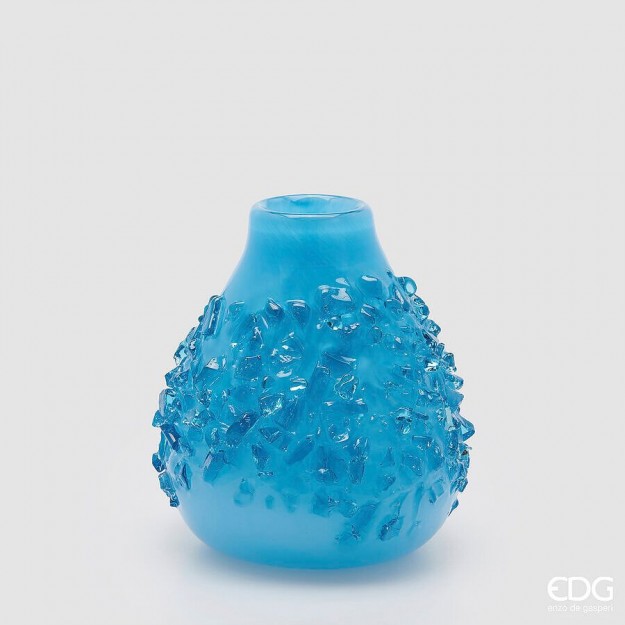 Elegante vaso decorativo in vetro azzurro, caratterizzato da una raffinata forma a goccia e impreziosito da gemme in vetro in rilievo tono su tono....
